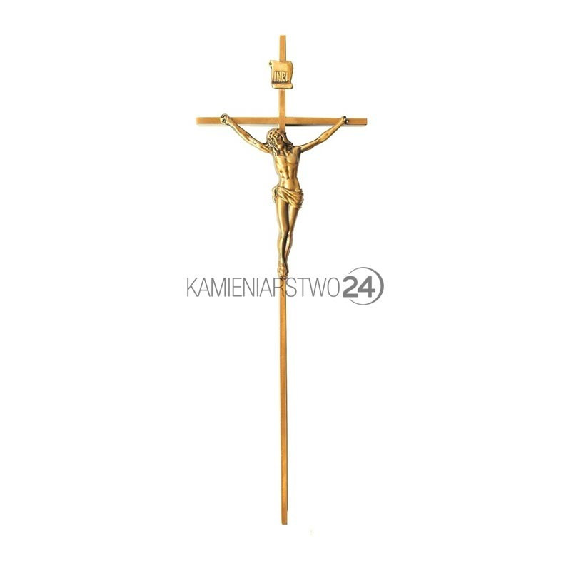 Złoty krzyż na nagrobek z wąskimi ramionami i pasyjką. Krzyż w całości wykonany z polerowanego, lakierowanego mosiądzu.