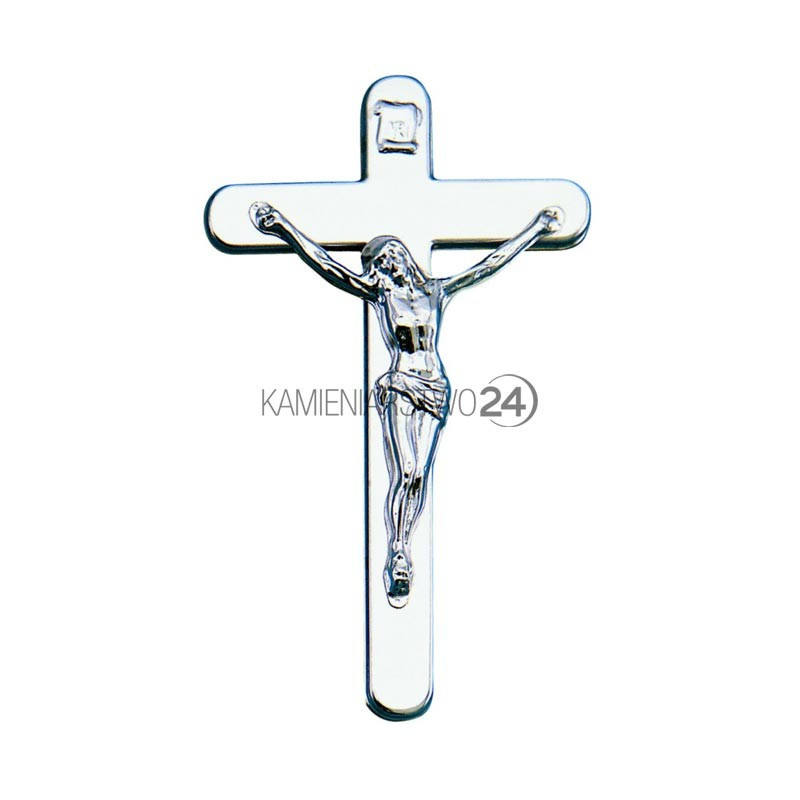 Srebrny krzyż na nagrobek z pasyjką i napisem INRI. Krzyż w całości wykonany ze stali nierdzewnej.